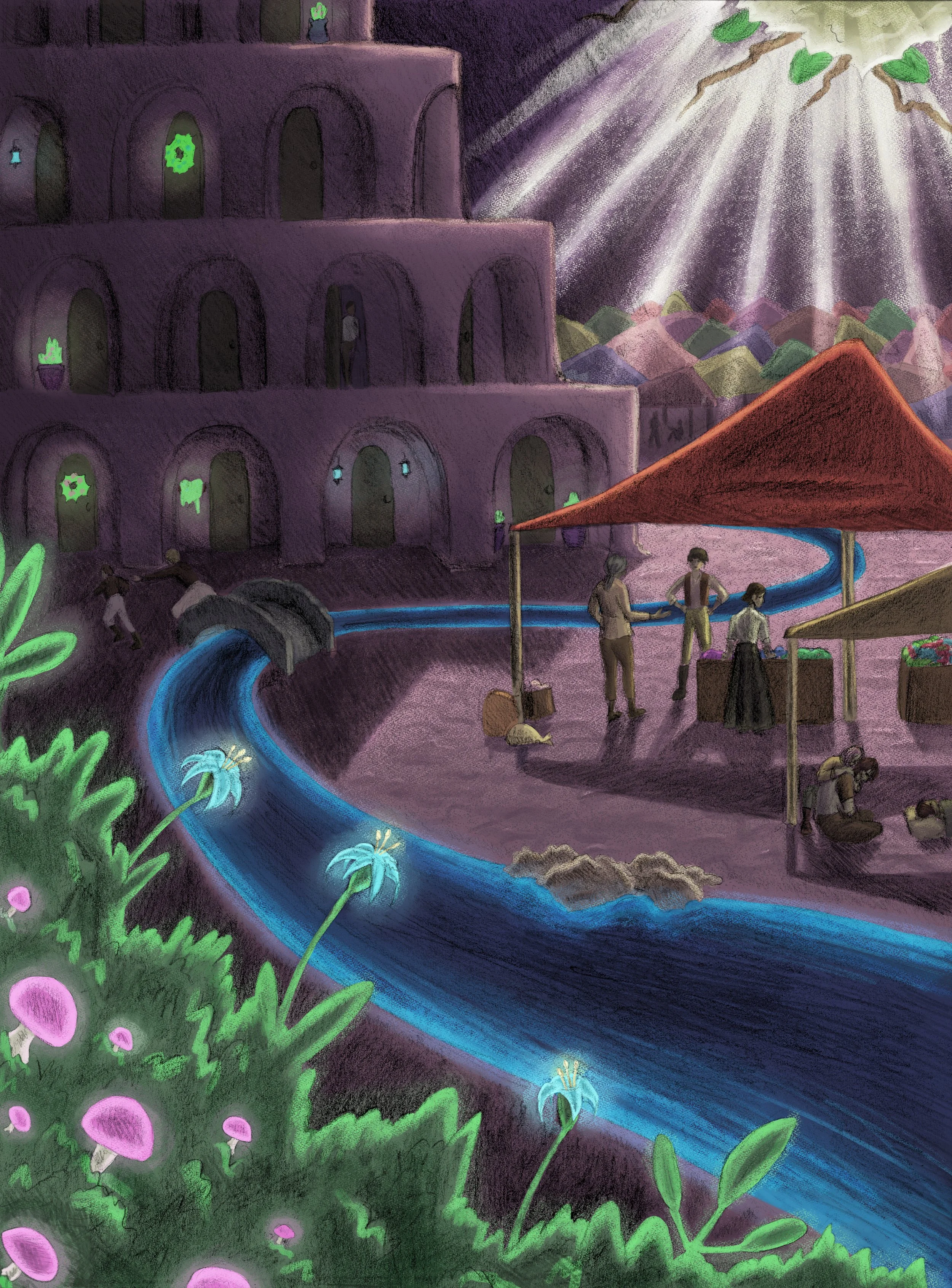 For my senior thesis I decided to create video game concept art. I came up with a story, and illustrated some of the most important parts of the story. For all of these pieces I drew them traditionally with pencil, then scanned them and colored them digitally with Clip Studio Paint. This series is called “Don’t Go Towards the Light”, and tells the story of a group of people who were trapped underground, but want to reclaim the surface.